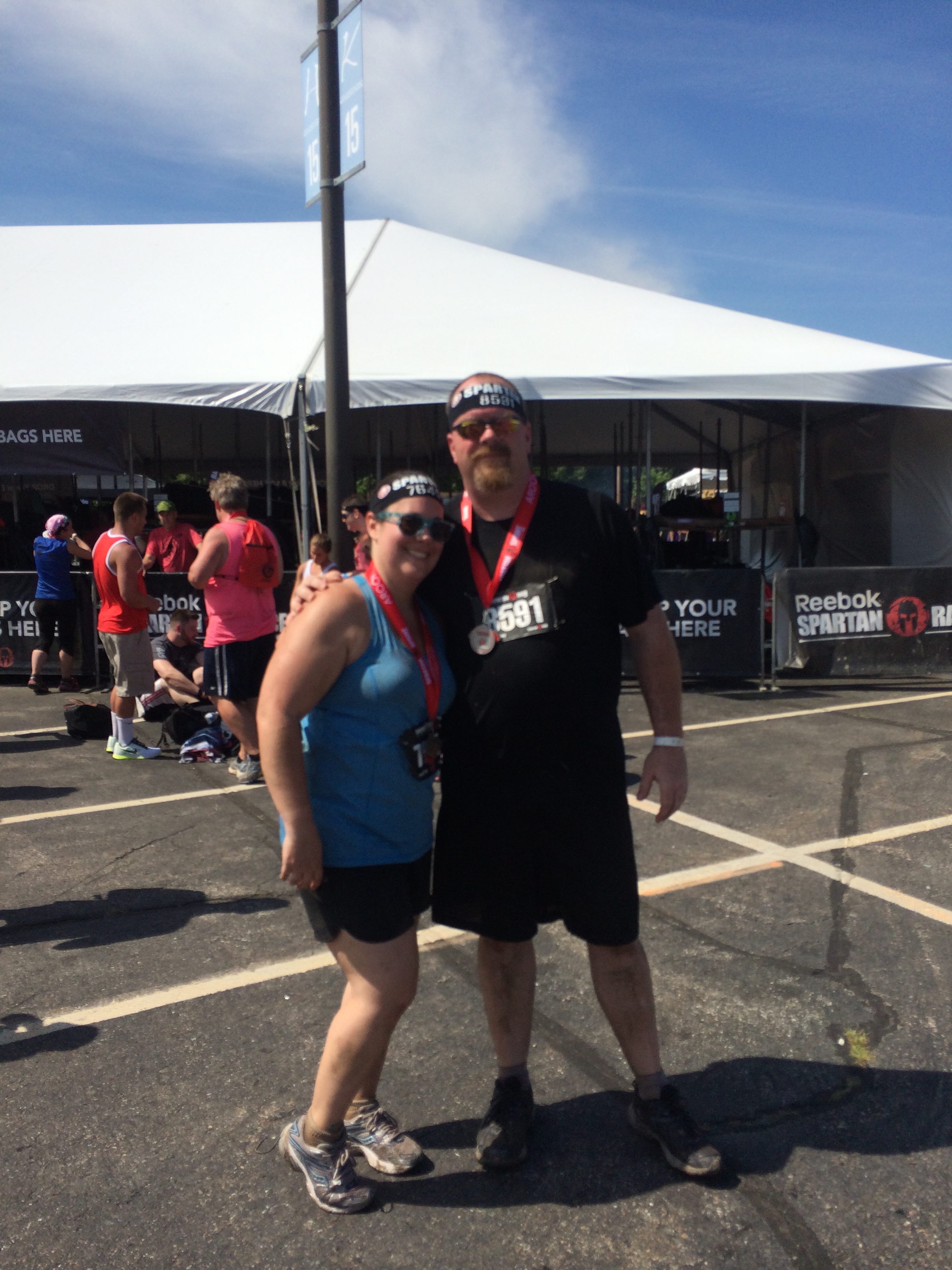 The race is a blur. We climbed over a wall into the start pen with the rest of our wave just like the Rugged Maniac, except a foot higher. Racers were already helping each other just get to the start line. The starter had everyone chanting a response to the question “Who am I?” “Spartan!” The gun went off and we ran. The first obstacle wasn’t really one at all but it caused the first injury. The course ran through levels of the parking garage and over guardrails. Angie fell. She got back up and would later complain that her biggest bruise was from that guardrail. We ran up hills and through drainage ditches until we came to the first real obstacle, an eight foot wall. Up and over, followed by more running. I briefly thought that things were looking better until we ran out of the forest we were in and smacked into the first of the obstacle complexes. Much like the finishing complex there were a group of challenges one after the other designed to wear you down. First was a crawl under barbed wire. This is found in every race, but the wire was hung much lower and it was real. It was sharp. People were bleeding on the other side, and that was over 50 yards away. Not 50 feet, 50 yards. Once through that you had to go up the inverted wall. It was only 6 feet high, but it was tipped back toward you so there was little purchase to help you over. Once over the wall there was a water station marking the first mile and a downhill jog of about 200 yards. That was to allow you to grab your sandbag and run back up the same hill, traverse the ridge for 100 yards, then run back down. Your 80 pound sandbag. It felt more like 100 by the top of the hill, and 150 pounds by the time you were allowed to drop it. Once we finished that we found the nicest family in the world.